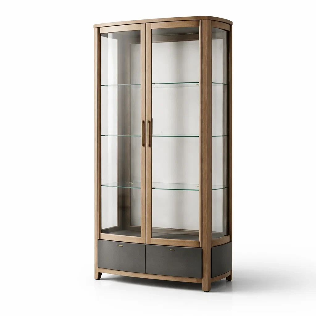 Diese Vitrine besteht aus einer Rahmenkonstruktion aus Eichenholz. Die Türen sind aus gehärtetem Glas gefertigt, was einen klaren Blick auf die Ausstellungsstücke ermöglicht.